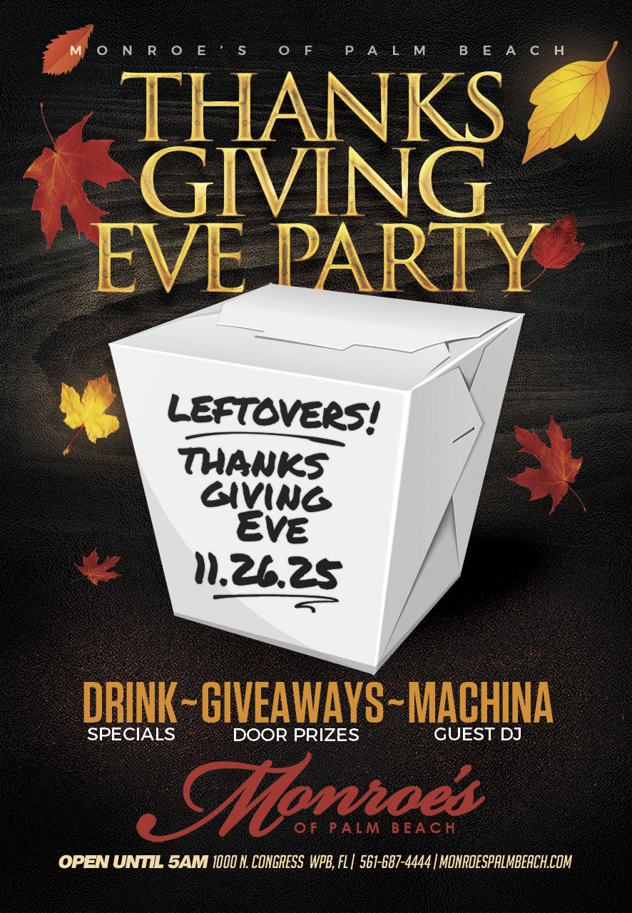 Monroe’s of Palm Beach is hosting a Thanksgiving Eve Party. “The Leftovers” Party features Live music by DJ Machina, Giveaway Door Prizes and your fall favorite craft cocktail drink specials. Bring your out of town guests and get ready for Thanksgiving 2025 at Monroe’s Palm Beach.