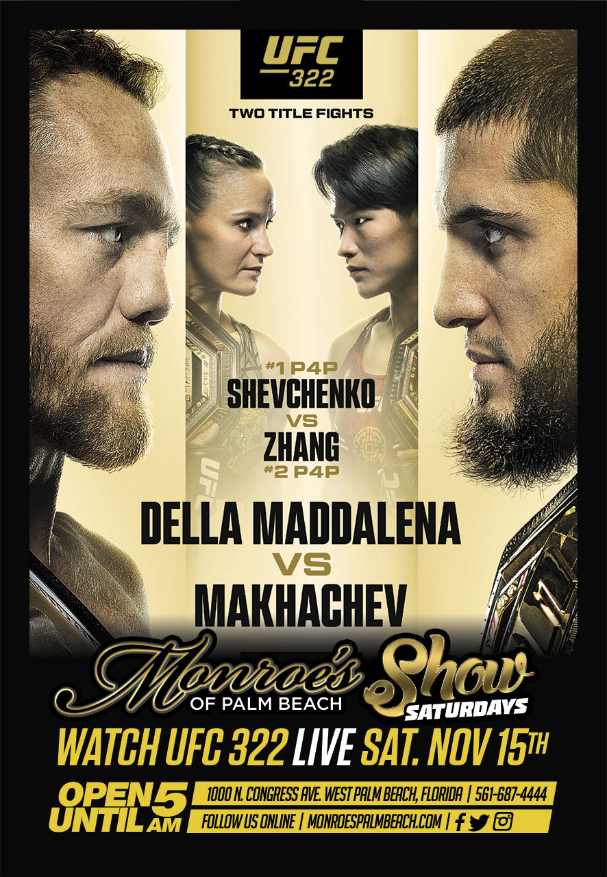 Monroe’s of Palm Beach is hosting a Live Watch Party on Saturday Nov. 15th 2025, for the highly anticipated UFC 322 Della Maddalena vs Makhachev